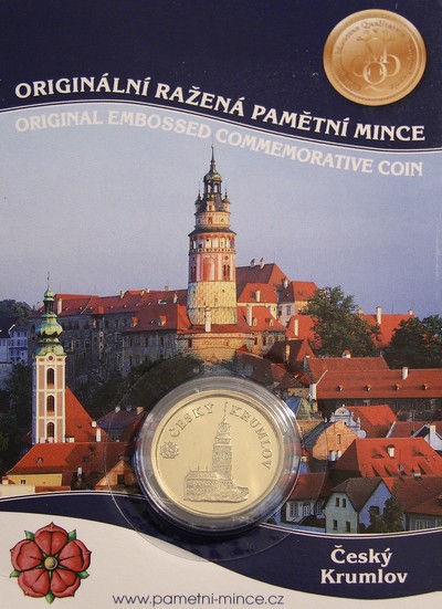 Na blistru je pohled na město Český Krumlov a základní informace v češtině a angličtině.