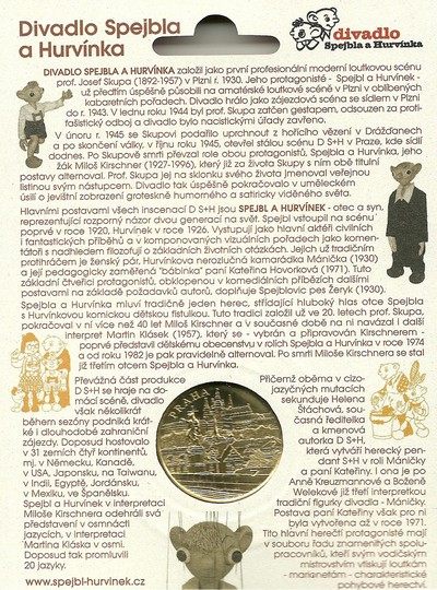 Na blistru je pohled na známé loutky z Divadla Spejbla a Hurvínka a základní informace v češtině a angličtině.