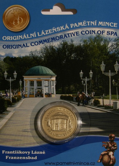 Na blistru je pohled na Františkovy Lázně a základní informace o místě v češtině a angličtině.