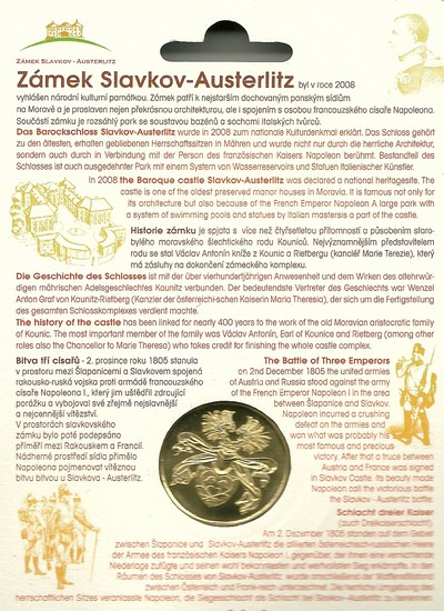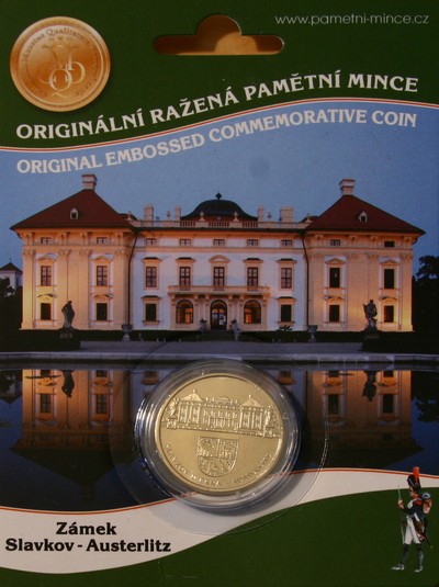 Na blistru je pohled na Zámek Slavkov u Brna a základní informace o místě v češtině a angličtině.