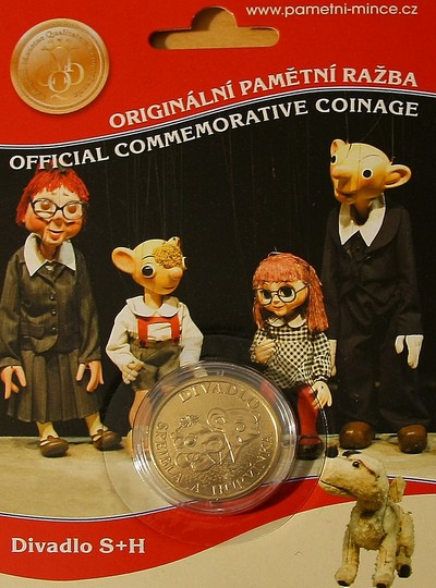 Na blistru je pohled na známé loutky z Divadla Spejbla a Hurvínka a základní informace v češtině a angličtině.